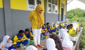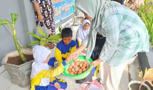 Selanjutnya, siswa menuju teras sekolah untuk makan bersama. Mereka membawa bekal bergizi dari rumah. Suasana semakin akrab saat Ibu Nur’ain Yunus dan Ibu Suhartin Amuntu membagikan telur rebus bantuan Japfa. Tidak hanya siswa, para guru pun mendapat bagian.