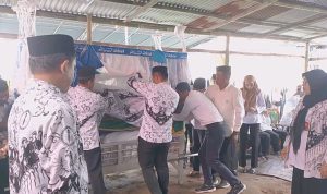 Upacara penghormatan terakhir berlangsung di rumah duka Dusun Tahele, Desa Buhu, Kecamatan Tibawa, Kabupaten Gorontalo Utara, Rabu (20/8/2025). Puluhan pendidik berkumpul memberikan penghormatan kepada rekan kerja yang telah berpulang.
